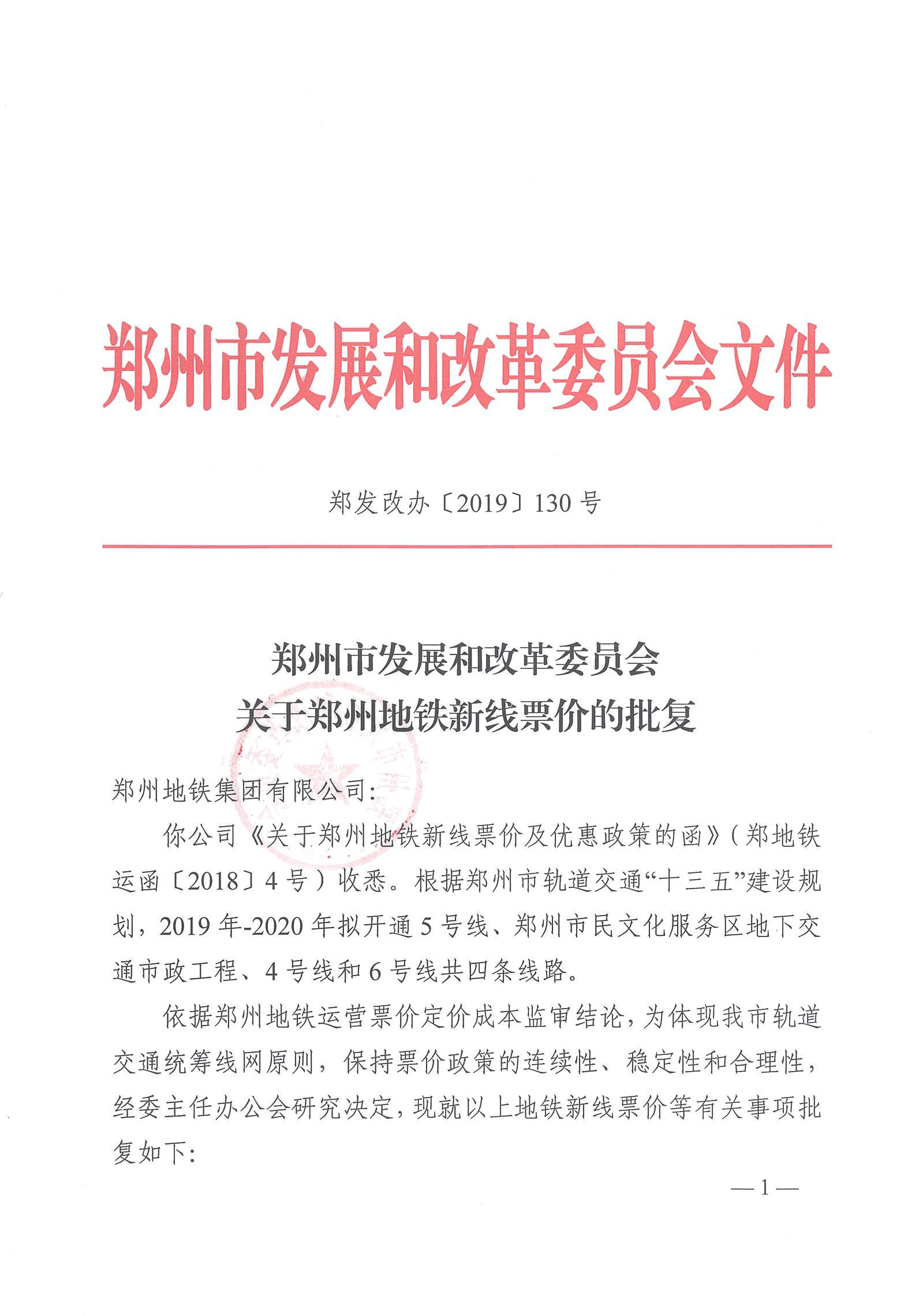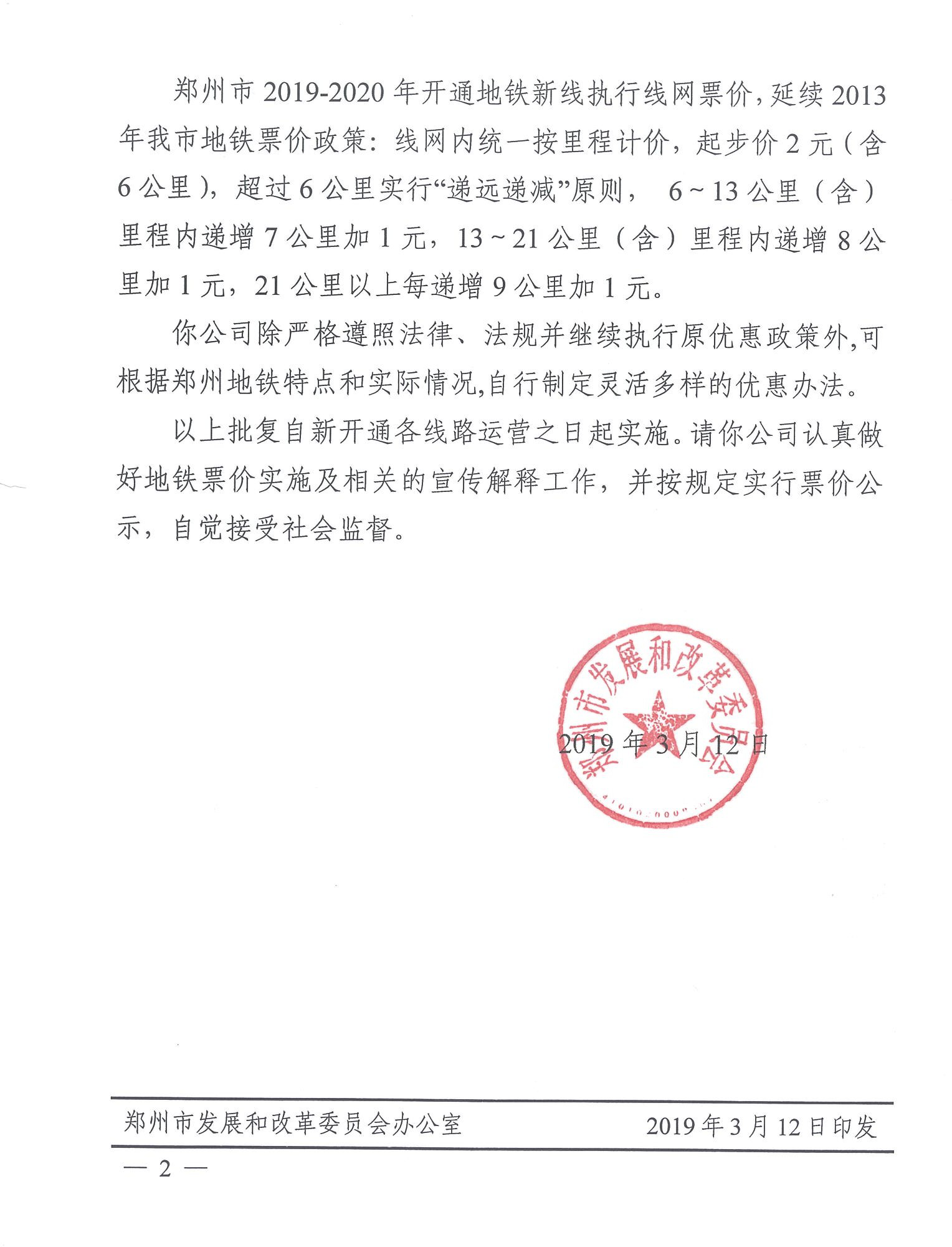 鄭州市發(fā)展和改革委員會關(guān)于鄭州地鐵新線票價的批復(fù)