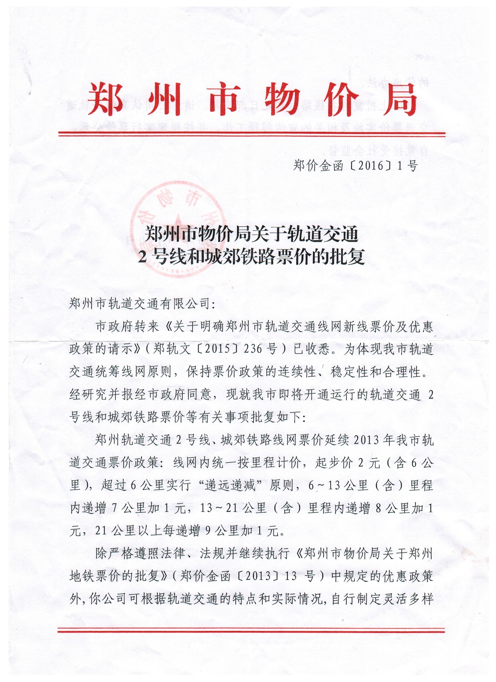 鄭州市物價局關于軌道交通2號線和城郊鐵路票價的批復