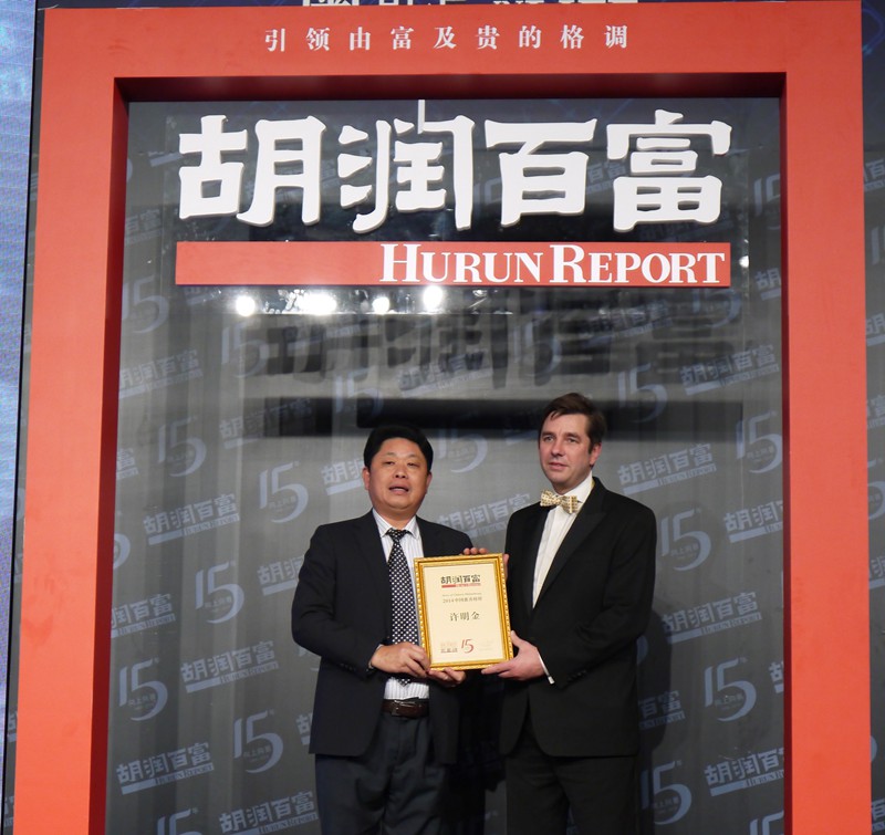 圖為胡潤先生親自為集團主席許明金先生頒獎